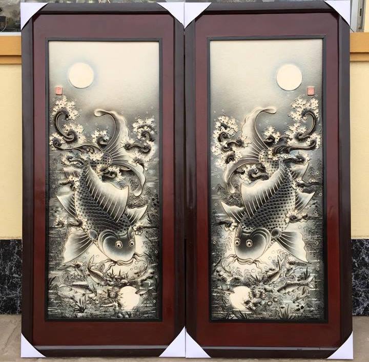Khung tranh màu nâu gỗ dùng cho tranh sứ Bát tràng chủ đề cá chép phong thủy