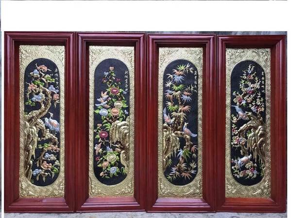 Bộ tứ quý chỉ thêu với khung màu nâu trơn sang trọng