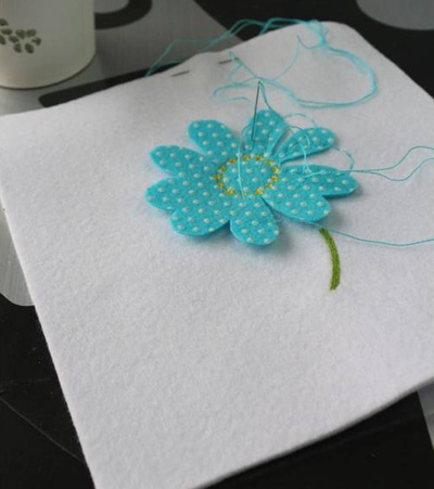 B1: Căt vải dạ màu xanh hình bông hoa có 9 cánh. Cắt vải dạ trắng hình vuông có kích thước bằng với kích thước nền khung ảnh. Đặt bông hoa xanh lên giữa tấm vải trắng, dùng chỉ vàng khâu chữ X nhỏ thành vòng tròn giữa bông hoa. Dùng chỉ màu xanh thêu bên dưới bông hoa làm cành hoa.