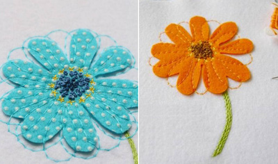B3: Dùng chỉ màu xanh khâu thắt nút làm nhụy hoa trong vòng tròn bông hoa màu vàng. Làm tương tự với bông hoa màu cam