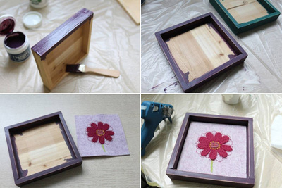 B4: Bạn dùng cọ quét lớp sơn lên trên 4 thành khung để khô. Sau đó, dùng súng bắn keo dán nền tranh vải đã khâu bông hoa lên trên nền khung gỗ. Lưu ý: Màu khung tranh cùng tông màu với bông hoa bên trong